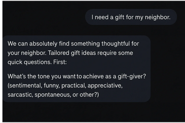 A: Just answer a few quick questions — who the gift is for, what they like — and your assistant will suggest amazing gift ideas. It’s fast, fun, and surprisingly magical.